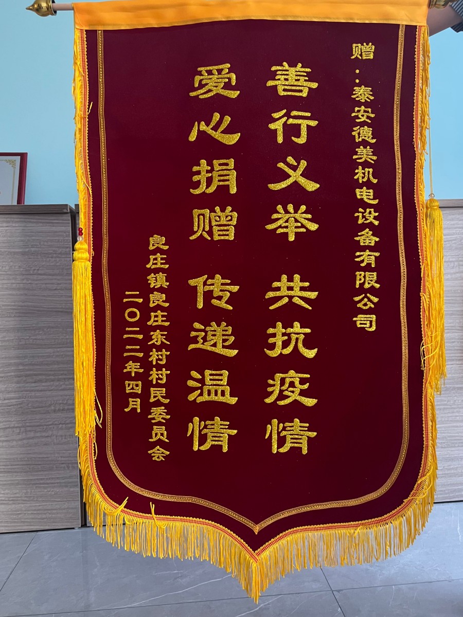 近日,良莊鎮(zhèn)良莊東村村民委員會將寫有“善行義舉,共抗疫情,愛心捐贈,傳遞溫情”的錦旗送到泰安德美機電設備有限公司,對本次抗擊疫情所做貢獻給予充分肯定!