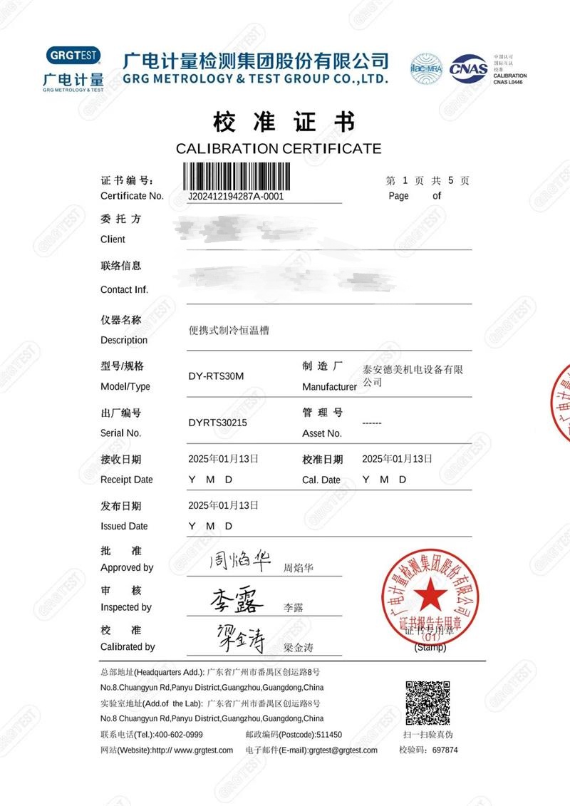 便攜式制冷恒溫槽(-30-105℃)校準證書 2025-1-25 本文被閱讀 5054 次