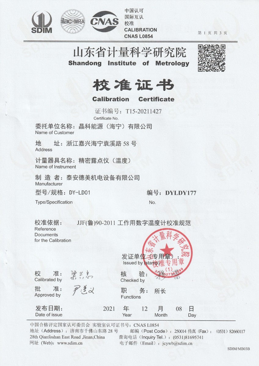 | 上一條:晶科能源(海寧)有限公司-精密露點(diǎn)儀(濕度) | 下一條:智能干體儀(六位半精度)校準(zhǔn)證書(shū) |