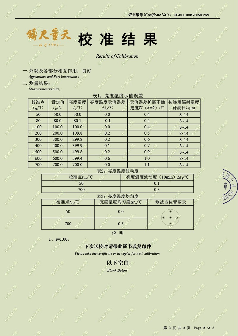 腔式黑體輻射源(50-700℃)校準證書 2025-5-9 本文被閱讀 2795 次