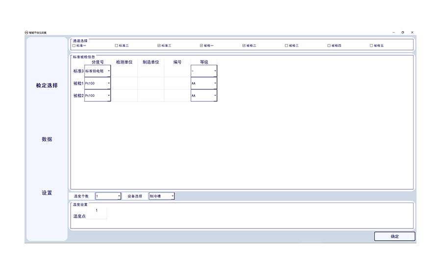 1.可實(shí)現(xiàn)設(shè)備的8通道的任意檢定選擇,可選擇通道的分度號(hào)類型,及被測(cè)傳感器的檢測(cè)單位、制造單位,傳感器編號(hào)及等級(jí)