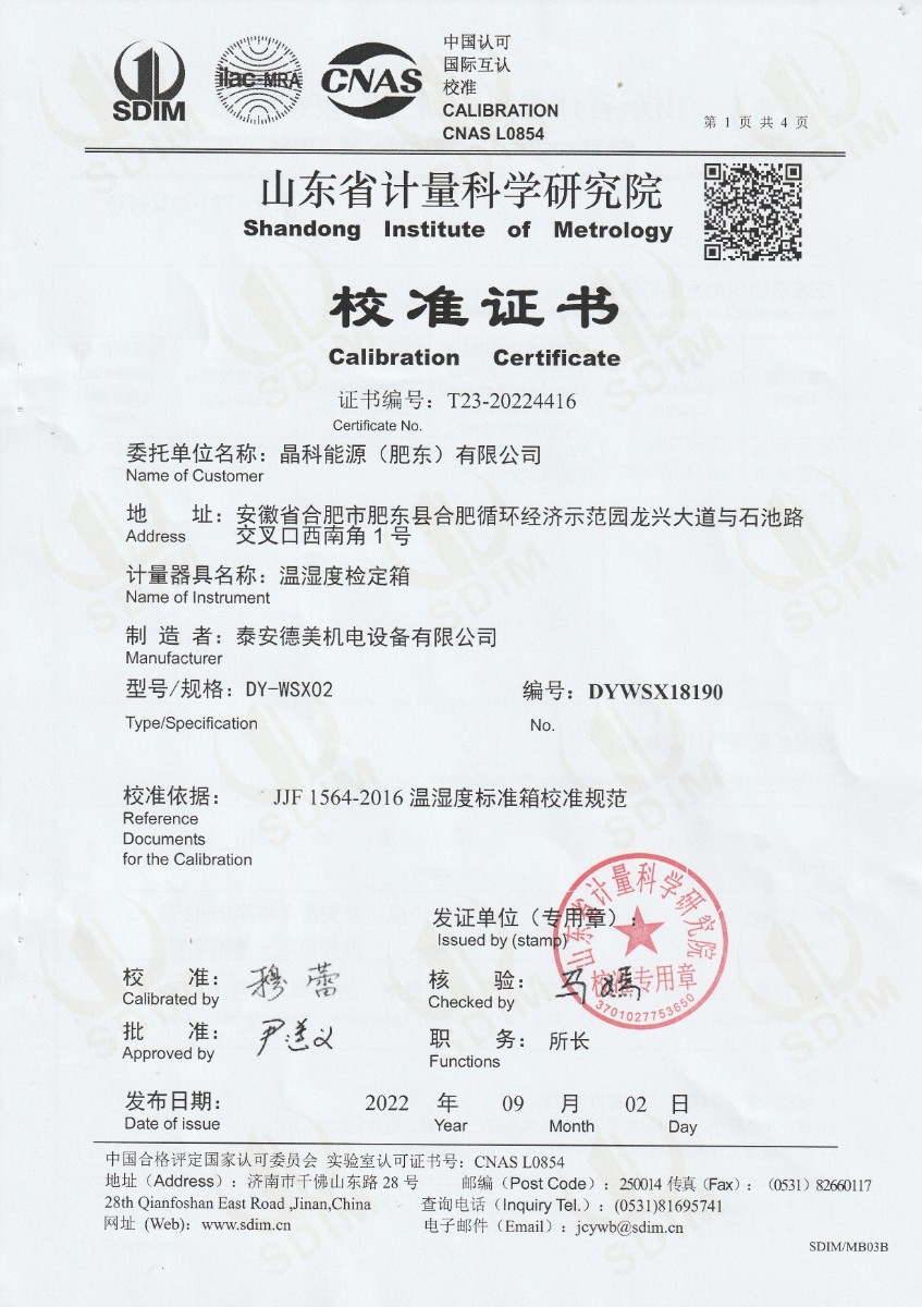 晶科能源(肥東)有限公司-溫濕度檢定箱 2022-9-15 本文被閱讀 16369 次