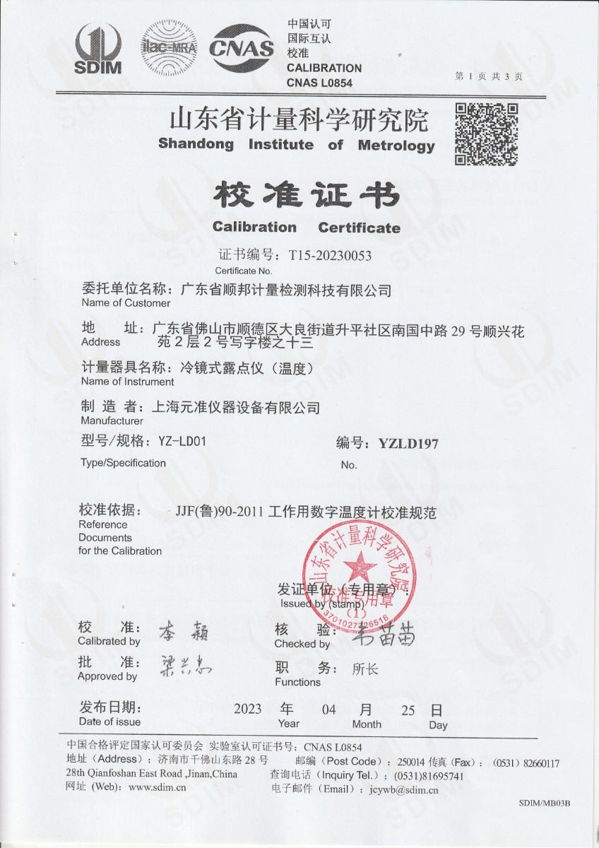 | 上一條:廣東省順邦計量檢測科技有限公司 冷鏡式露點(diǎn)儀 檢定證書 | 下一條:智能干體儀(六位半精度)校準(zhǔn)證書 |