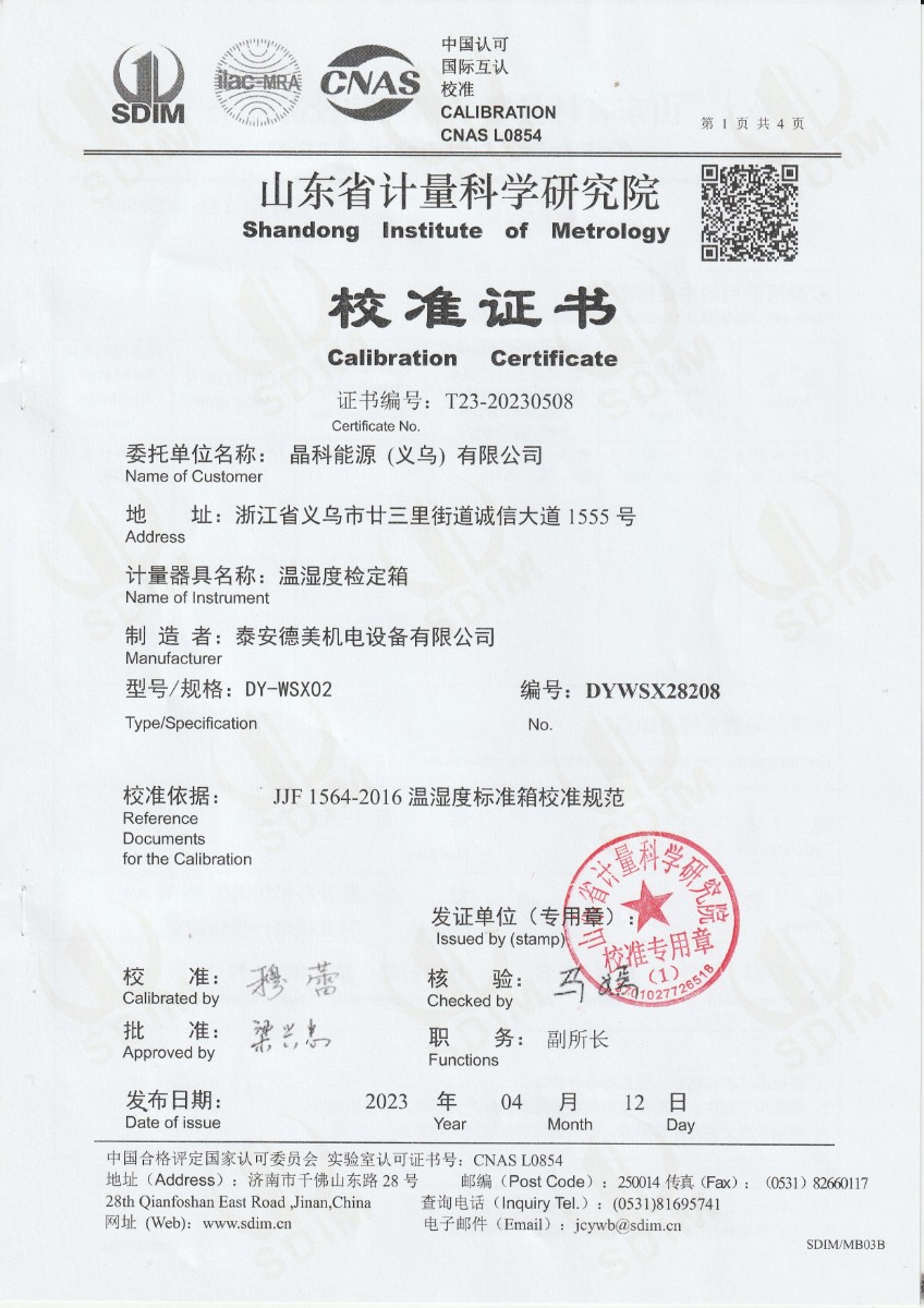 | 上一條:晶科能源(義烏)有限公司 精密露點儀(溫度)校準(zhǔn)證書 | 下一條:智能干體儀(六位半精度)校準(zhǔn)證書 |