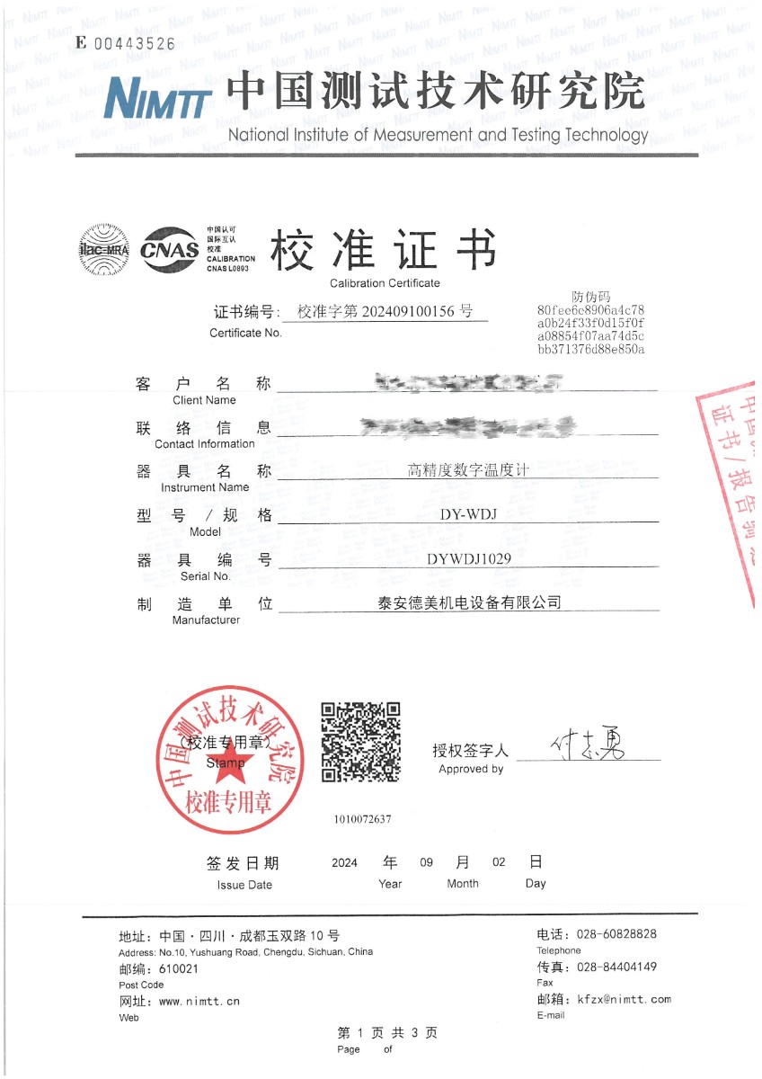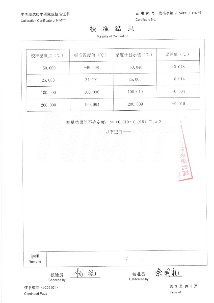 高精度數(shù)字溫度計(-50~200℃)校準證書 2024-9-6 本文被閱讀 5766 次