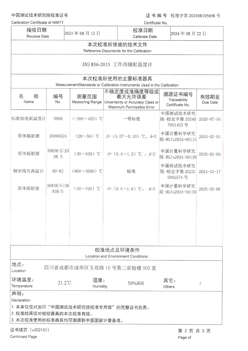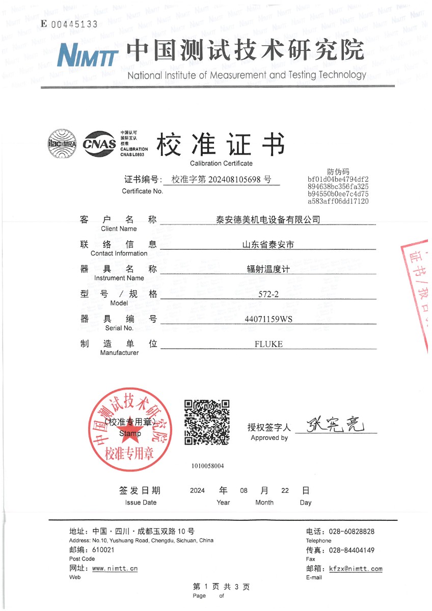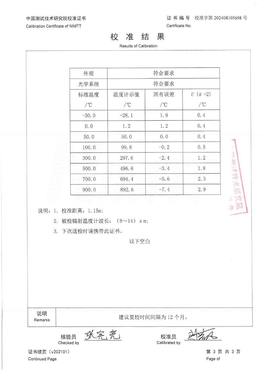 泰安德美-輻射溫度計(-30~900℃)校準證書 2024-9-9 本文被閱讀 6481 次