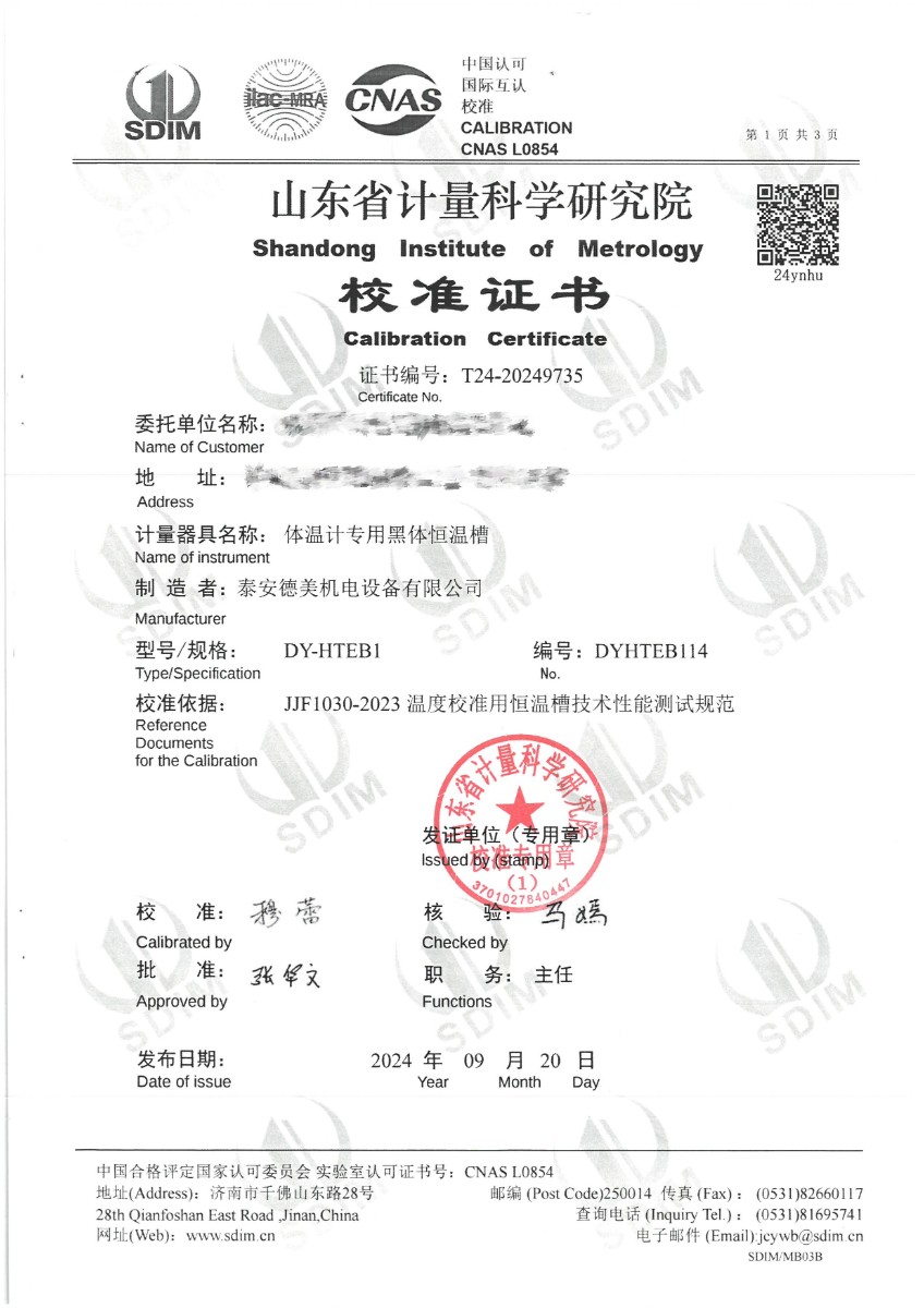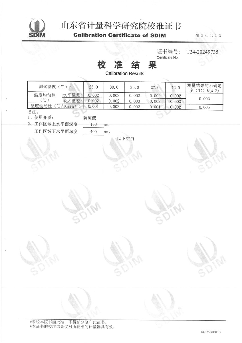 體溫計專用黑體恒溫槽(-20~100℃)校準證書