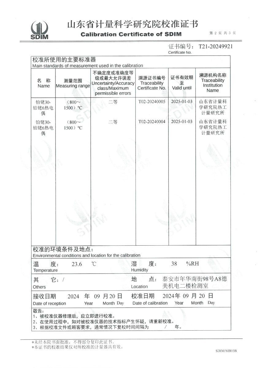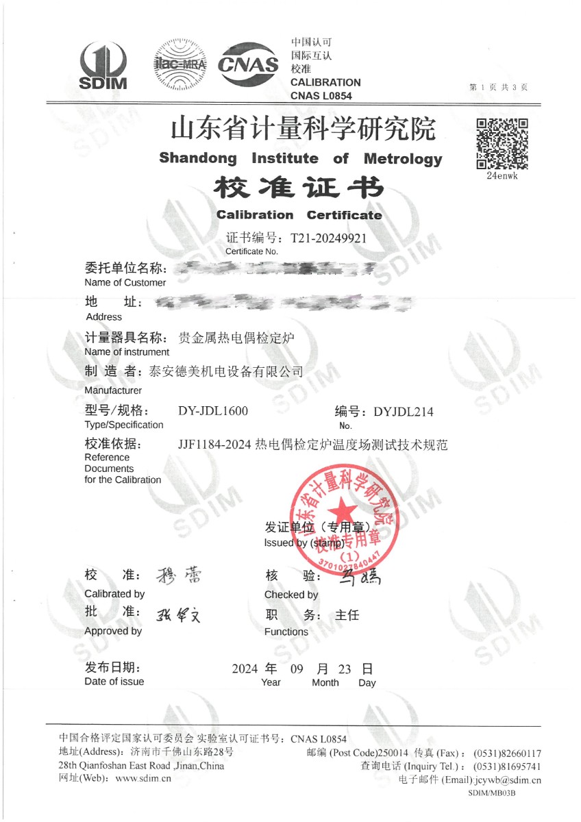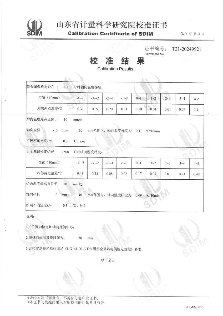 貴金屬熱電偶檢定爐(800~1600℃)校準證書 2024-9-24 本文被閱讀 6233 次