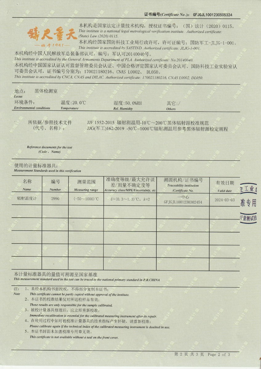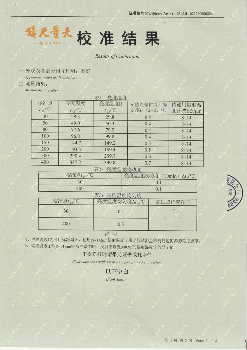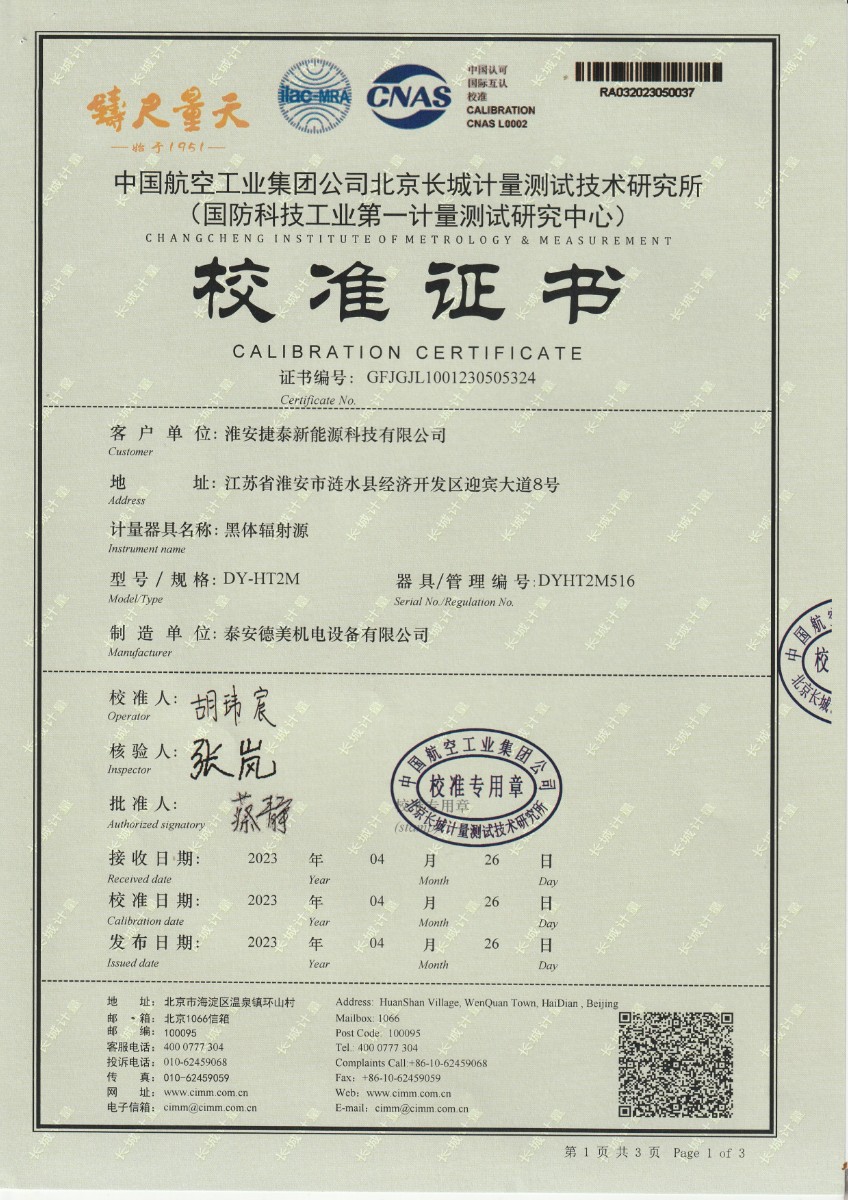 淮安捷泰新能源科技有限公司 黑體輻射源 校準證書 2023-5-18 本文被閱讀 10485 次