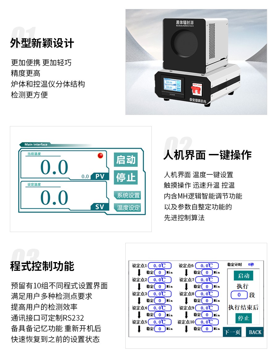 標(biāo)準(zhǔn)黑體作為標(biāo)準(zhǔn)輻射源,主要用于校準(zhǔn)輻射溫度計(jì)、紅外溫度計(jì)和輻射溫度傳感探測(cè)器。我公司目前具有先進(jìn)的黑體技術(shù),產(chǎn)品種類全、溫度范圍寬的黑體系列產(chǎn)品。產(chǎn)品體積小、重量輕、便于攜帶,不僅適合各級(jí)計(jì)量機(jī)構(gòu)實(shí)驗(yàn)室校準(zhǔn)輻射溫度計(jì)使用,同時(shí)可以用于現(xiàn)場(chǎng)校準(zhǔn)。