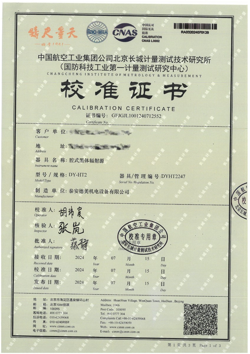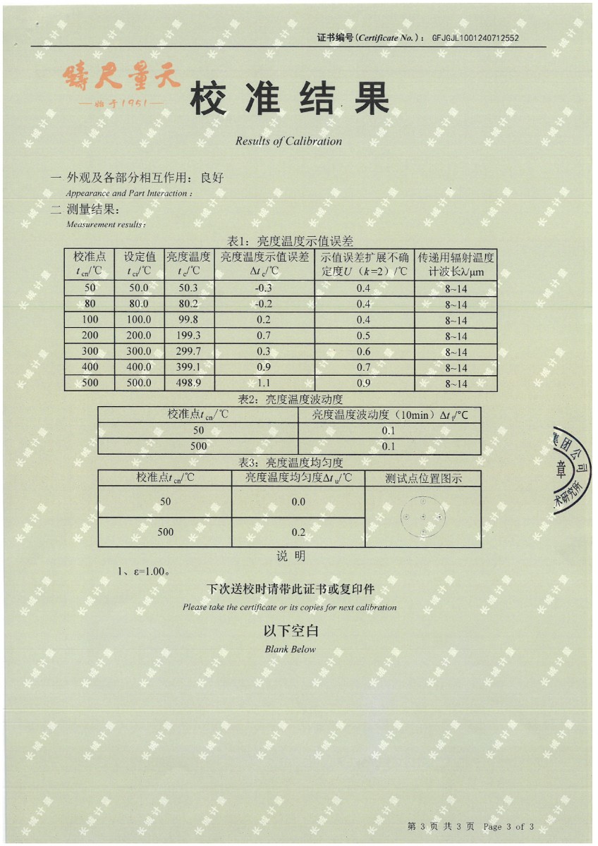 腔式黑體(50~500℃)校準證書 2024-7-29 本文被閱讀 7763 次