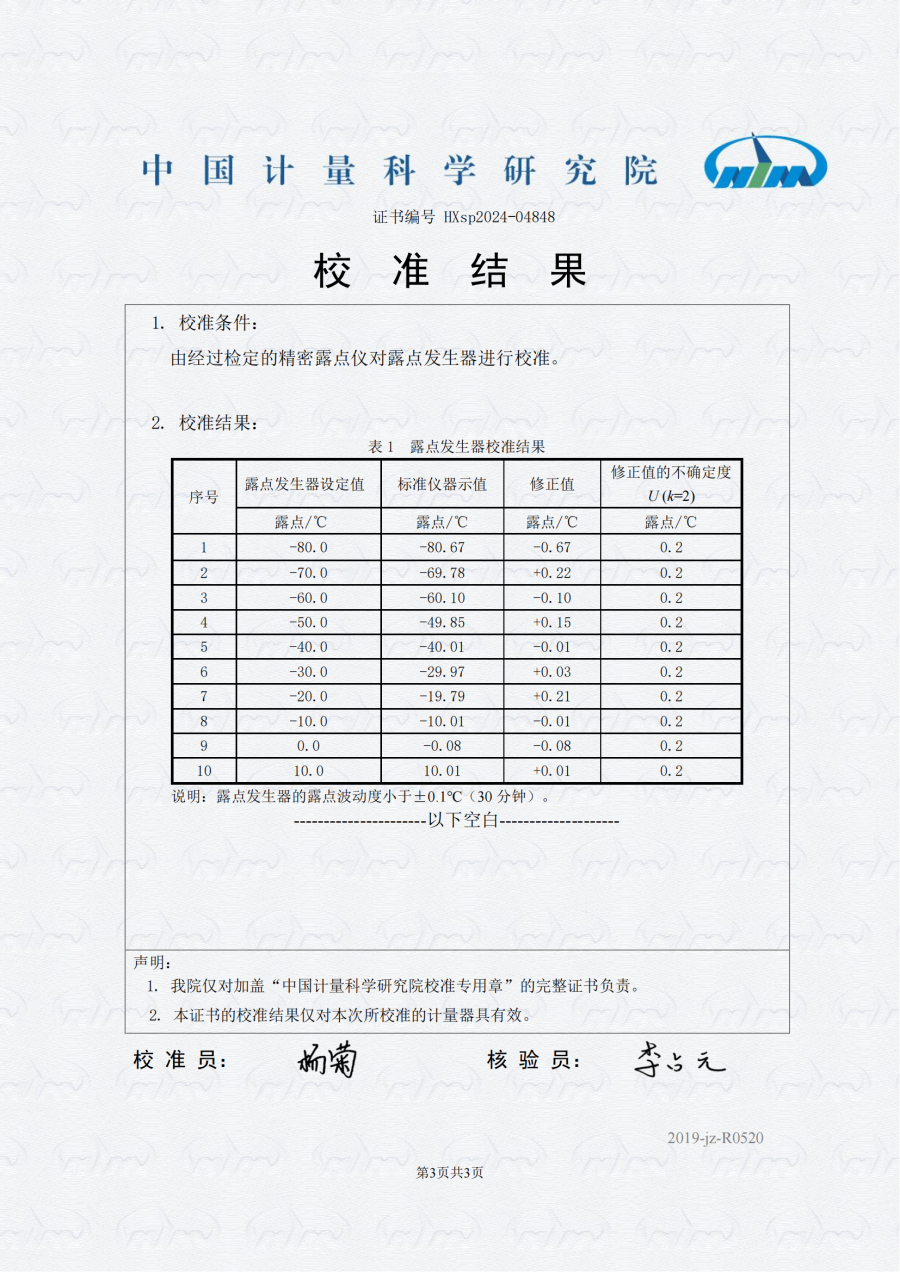 標(biāo)準(zhǔn)濕度發(fā)生器校準(zhǔn)證書