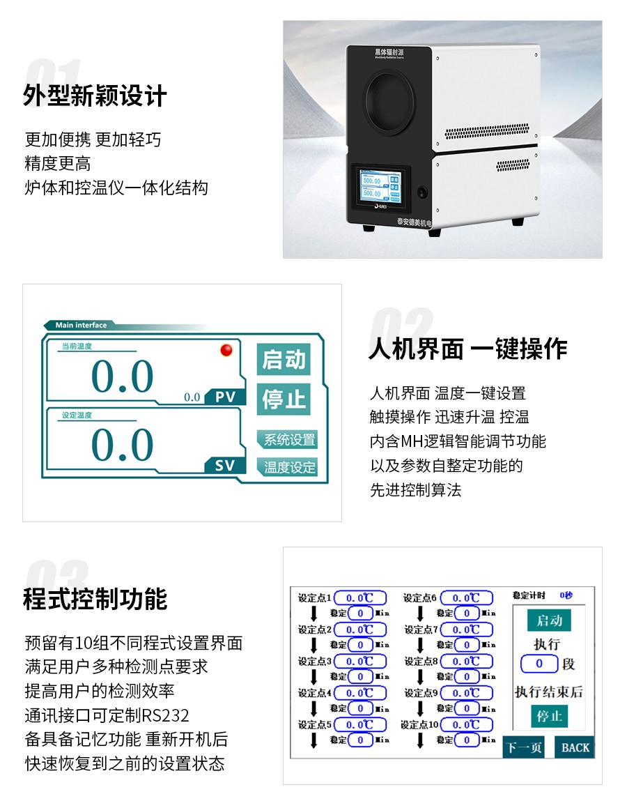 5)大面源等溫黑體輻射面,發(fā)射率可調(diào)功能(0.95-1 之間可調(diào),出廠默認(rèn)發(fā)射率 0.95)。