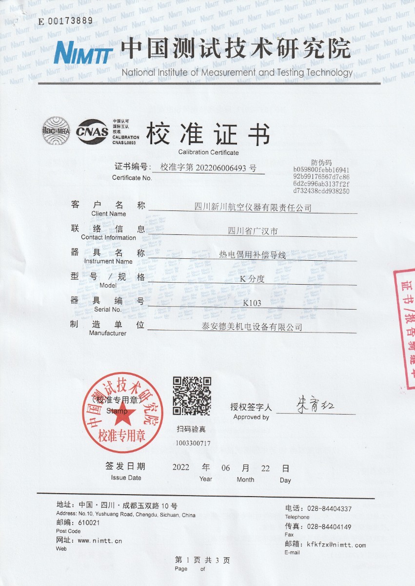 | 上一條:四川新川航空儀器有限責(zé)任公司-S分度補(bǔ)償導(dǎo)線 | 下一條:智能干體儀(六位半精度)校準(zhǔn)證書 |