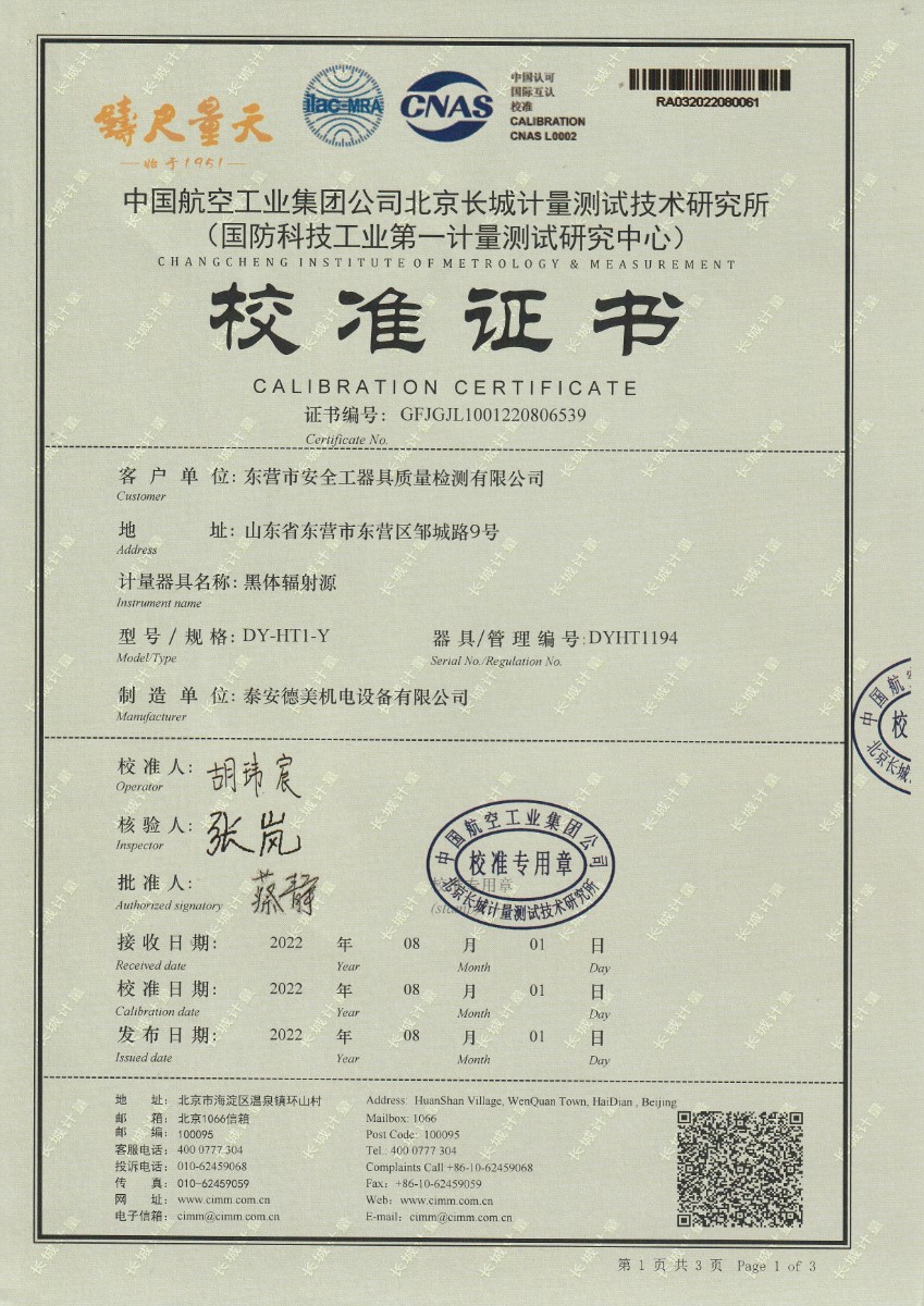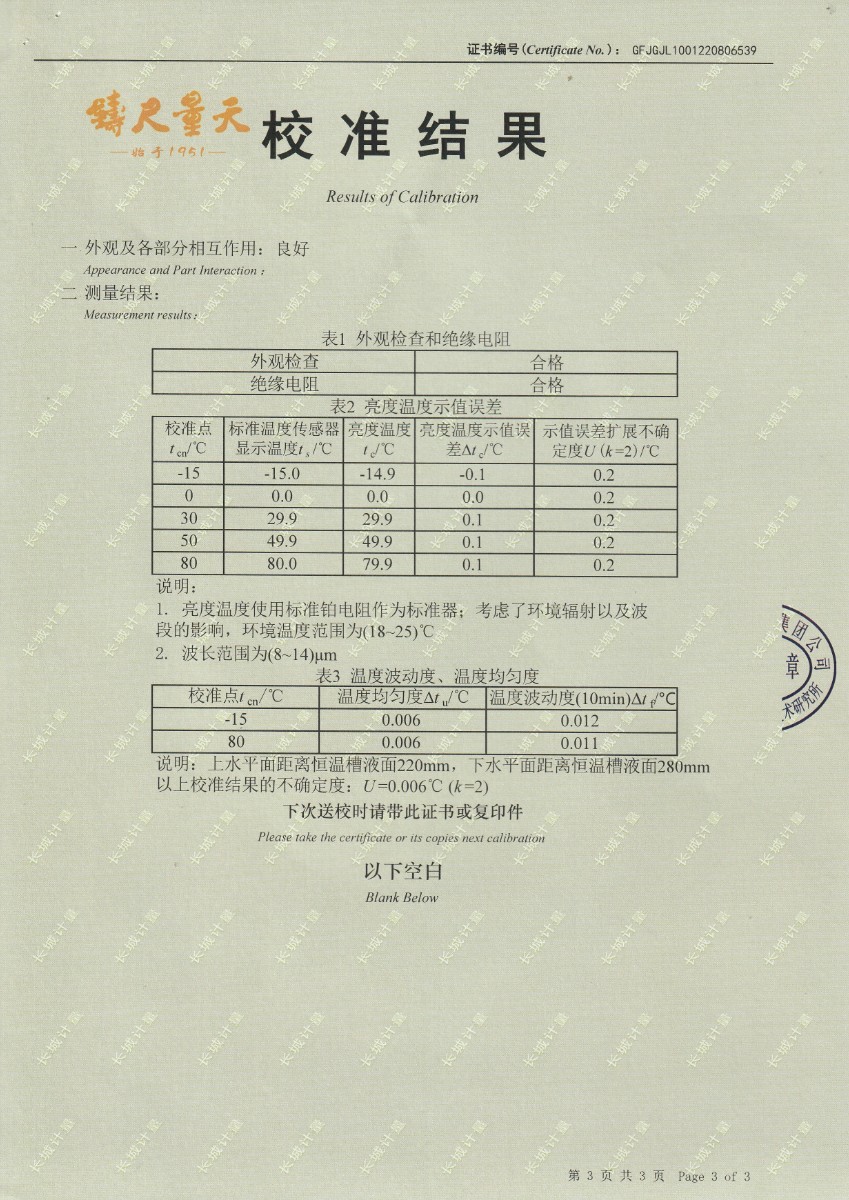 | 上一條:東營市安全工器具質(zhì)量檢測有限公司-黑體輻射源DY-HT2 | 下一條:智能干體儀(六位半精度)校準(zhǔn)證書 |