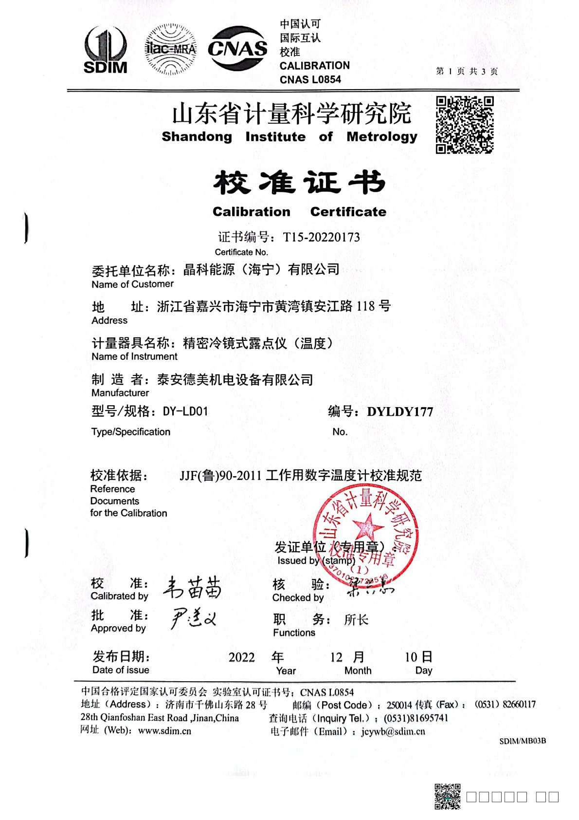 晶科能源(海寧)有限公司 精密冷鏡式露點儀(溫度) 校準證書 2023-1-12 本文被閱讀 12323 次