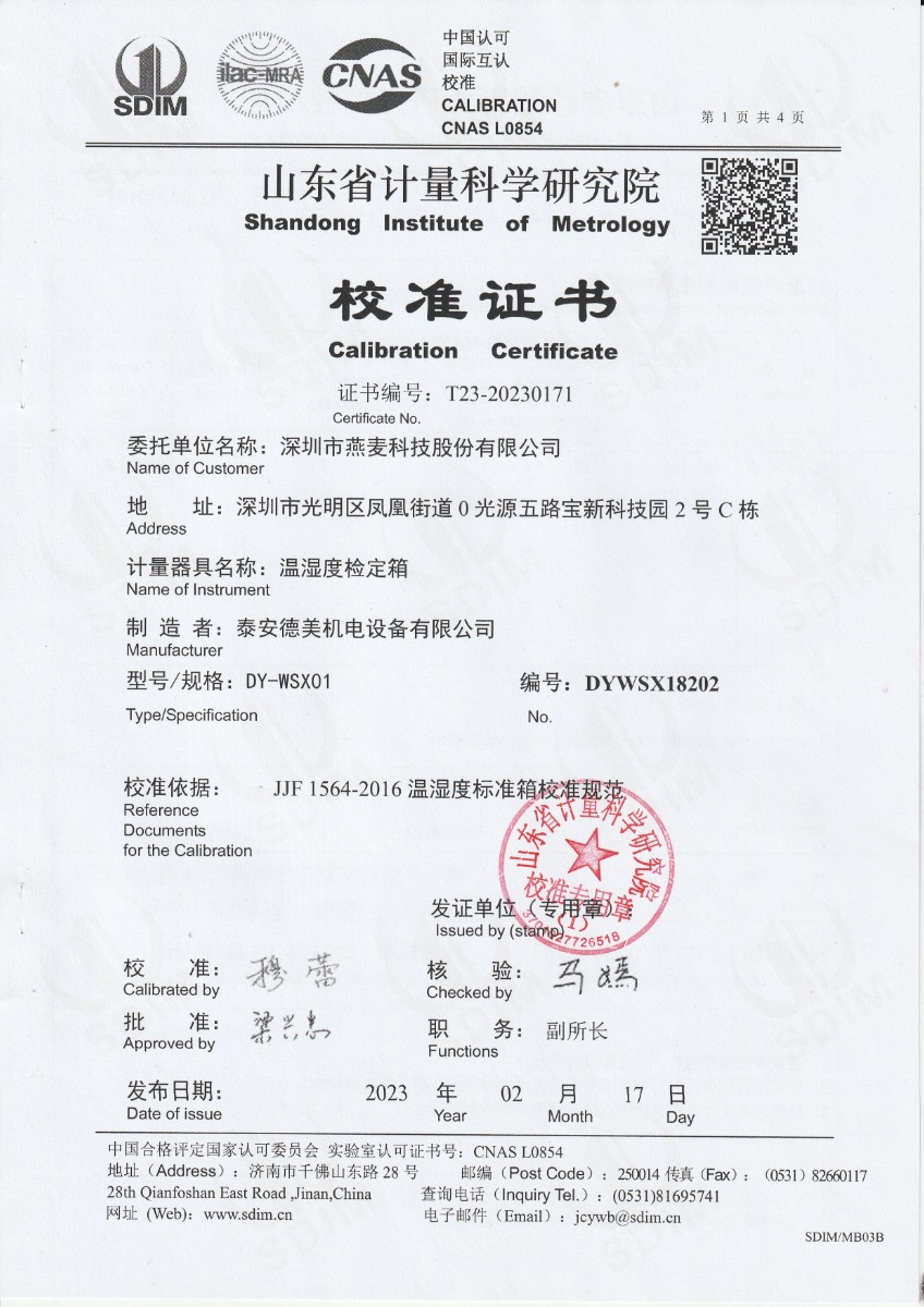 深圳市燕麥科技股份有限公司 溫濕度檢定箱 校準證書 2023-3-2 本文被閱讀 13795 次