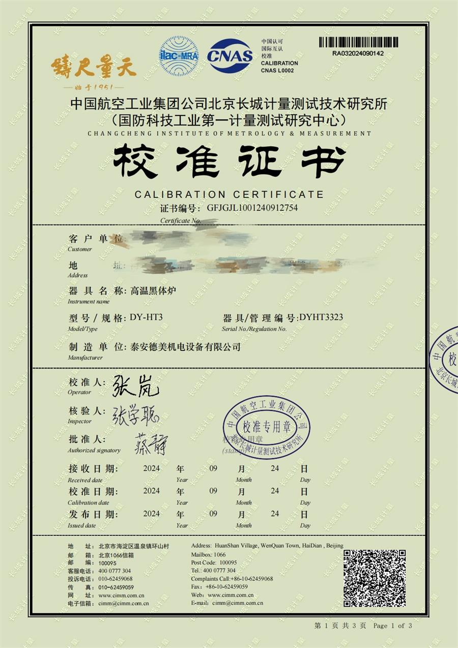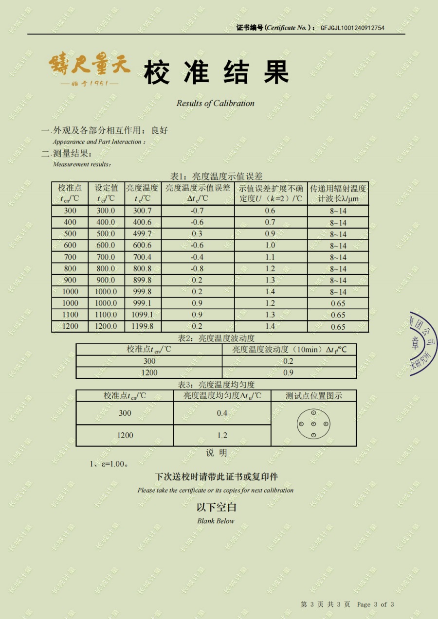 高溫黑體爐(300-1200℃)校準證書 2024-10-17 本文被閱讀 5593 次