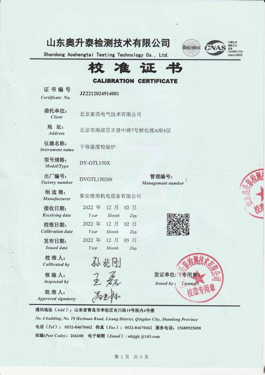 | 上一條:北京索英電氣技術(shù)有限公司 干體溫度校驗爐 | 下一條:智能干體儀(六位半精度)校準(zhǔn)證書 |