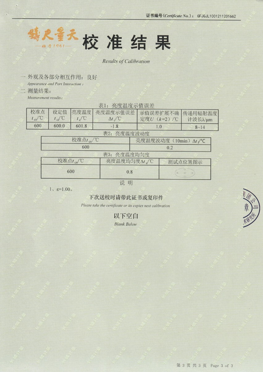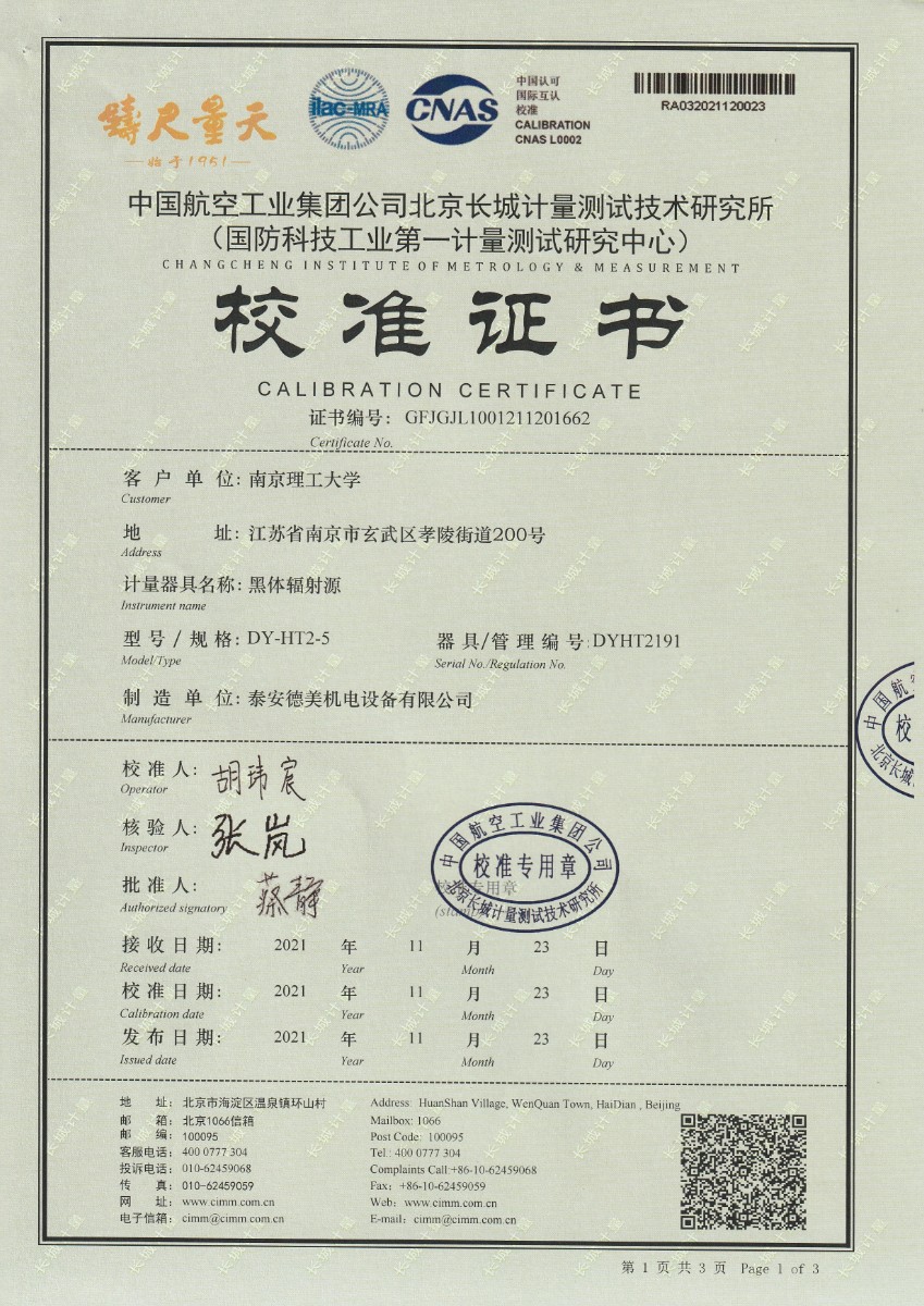 南京理工大學-黑體輻射源校準證書600℃ 2021-12-4 本文被閱讀 14638 次