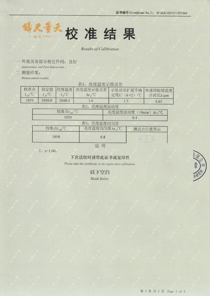 南京理工大學-黑體輻射源校準證書1050℃ 2021-12-4 本文被閱讀 14571 次