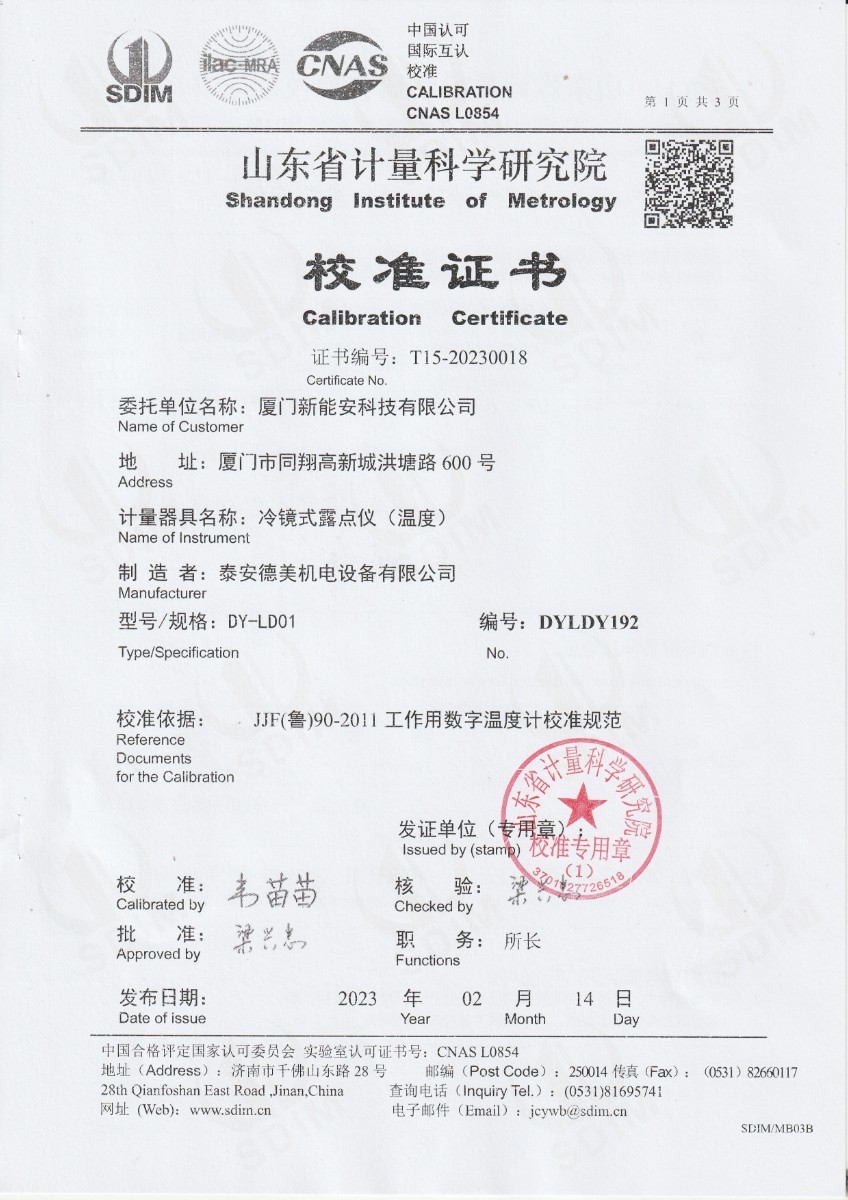 廈門新能安科技有限公司 冷鏡式露點儀(溫度) 校準證書 2023-2-25 本文被閱讀 10435 次