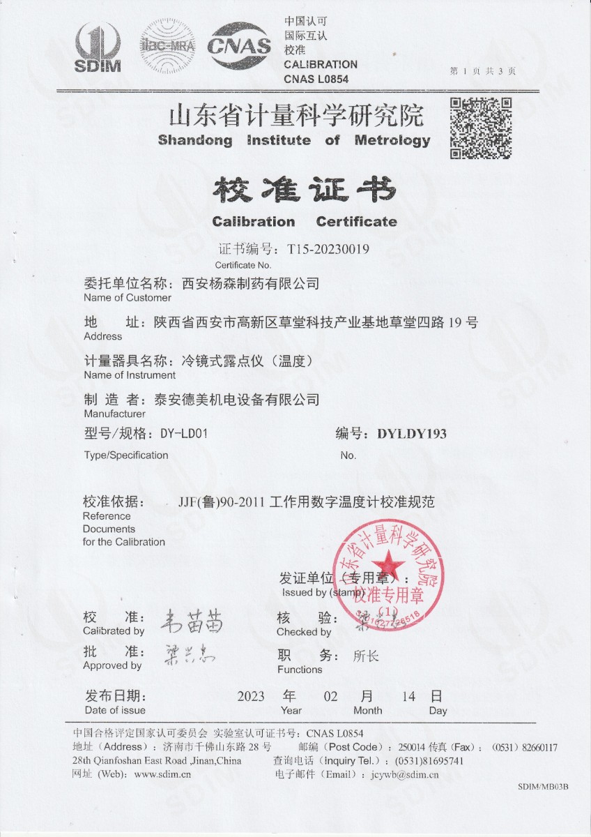 西安楊森制藥有限公司 冷鏡式露點儀(溫度) 校準證書 2023-2-25 本文被閱讀 12688 次