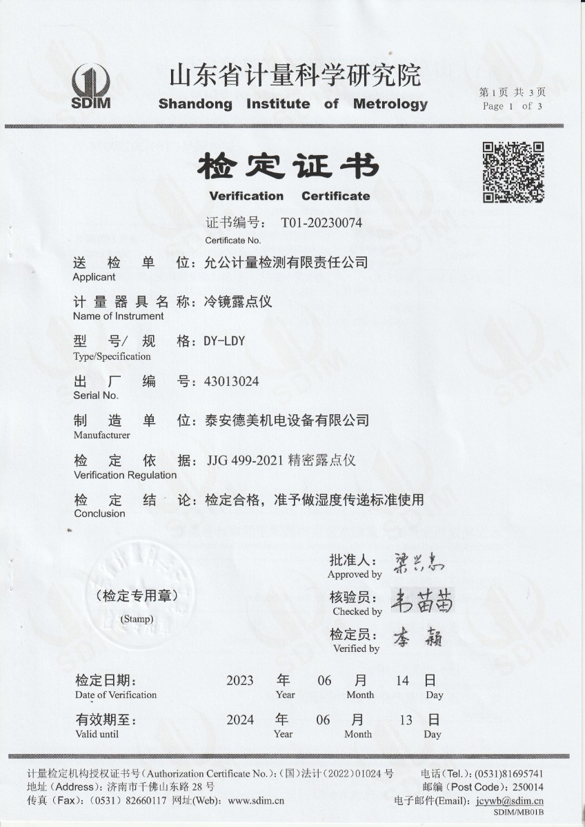 | 上一條:允公計(jì)量檢測(cè)有限責(zé)任公司-冷鏡露點(diǎn)儀校準(zhǔn)證書 | 下一條:智能干體儀(六位半精度)校準(zhǔn)證書 |