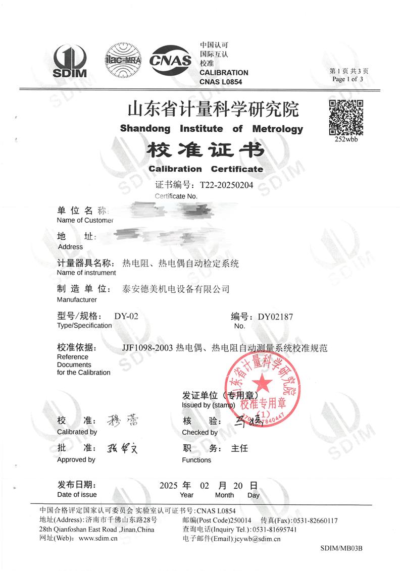 熱電阻、熱電偶自動檢定系統(tǒng)校準證書 2025-2-26 本文被閱讀 4753 次