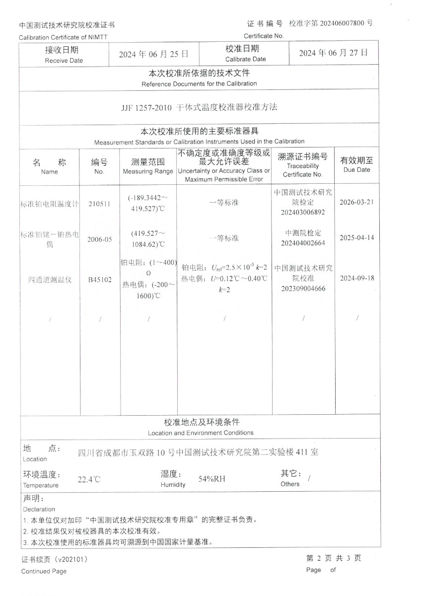 高溫干體爐(300~1200℃)校準(zhǔn)證書 2024-7-1 本文被閱讀 6206 次