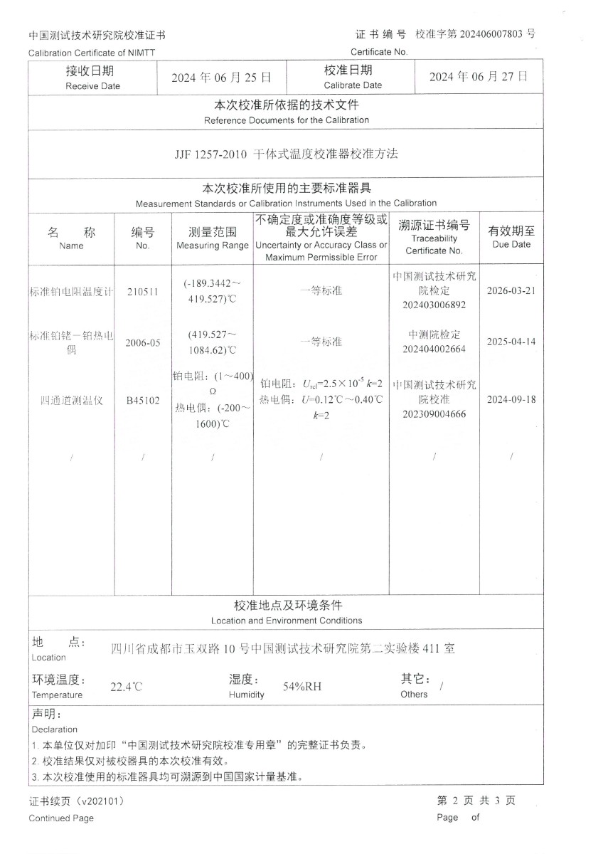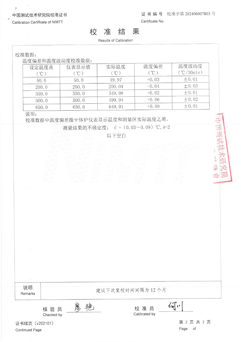 中溫干體爐(50~650℃)校準證書 2024-7-1 本文被閱讀 6328 次