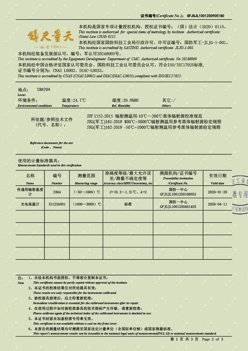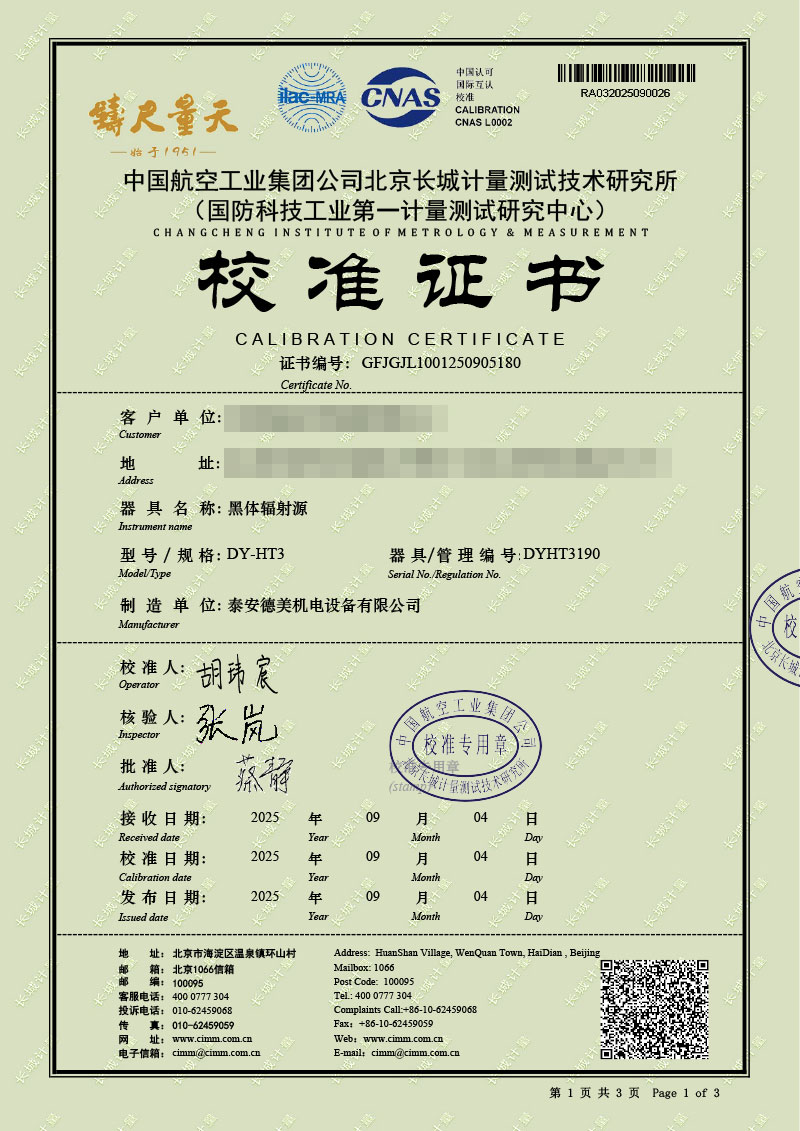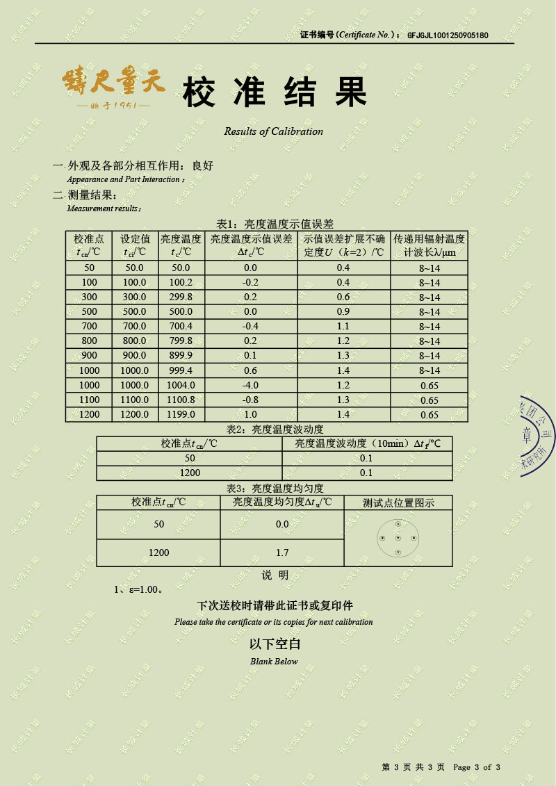 黑體輻射源(50-1200℃)校準證書 2025-9-22 本文被閱讀 943 次